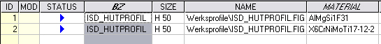 Soll das Hutprofil in weiteren Materialien zur Auswahl angeboten werden, dann öffnen Sie die Tabelle ISD EXAMPLE mit dem Katalogeditor. Kopieren Sie einen Datensatz des Hutprofils und fügen Sie die Kopie als neuen Datensatz ein. Geben Sie das neue Material ein, und speichern Sie die Tabelle. Beim nächsten Aufruf der Funktion Werksprofile steht die erweiterte Auswahl zur Verfügung.