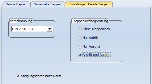 Auf der Registerkarte Einstellungen: Gerade Treppe wählen Sie den Schraubentyp und die Festigkeitsklasse der Schrauben, die zur Befestigung der Stufen an die Wangen benötigt werden. Darüber bestimmen Sie die Art der Treppenlochbegrenzung.