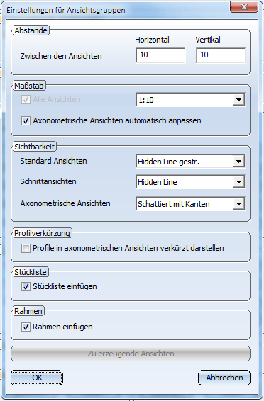 Hier wird automatisch ein DIN-Rahmen gewählt, der die erzeugten Ansichtsgruppen vollständig und unskaliert enthält. Die Option Maßstab an Rahmengröße anpassen ist dann nicht verfügbar.