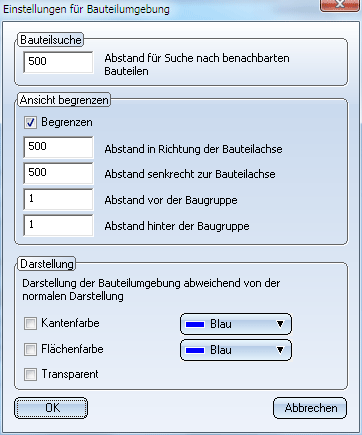 Sollen die Teile der Bauteilumgebung nicht vollständig angezeigt werden, dann lässt such die Ansicht begrenzen. Dazu aktivieren Sie die Checkbox und geben die Werte für Begrenzung an. Alles was außerhalb des Bereiches liegt, wird dann nicht dargestellt.