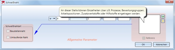 Bei Anschlüssen vom Typ 1 lassen sich in die Schweißnahtbeschriftung auch Einzelheiten über Prozesse, Bewertungsgruppen, Arbeitspositionen, Zusatzwerkstoffe, Hilfsstoffe u.v.m. eintragen. Diese lassen sich als Favoriten ablegen und stehen so jederzeit wieder zur Verfügung. (SP1)
