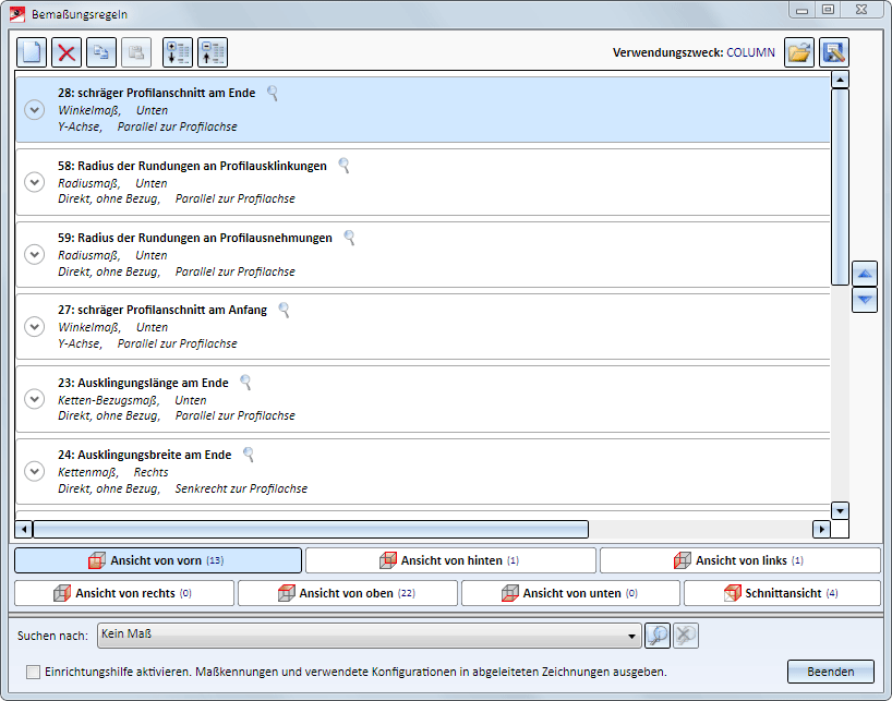 Bemaßungsregeln für Werkstattzeichnungen werden über das Konfigurationsmanagement (isdconfigeditor.exe) verwaltet. Zur komfortablen Bearbeitung dieser Regeln ist in HiCAD ein Editor für Bemaßungsregeln integriert, den Sie mit der Funktion
