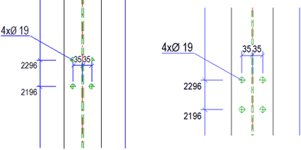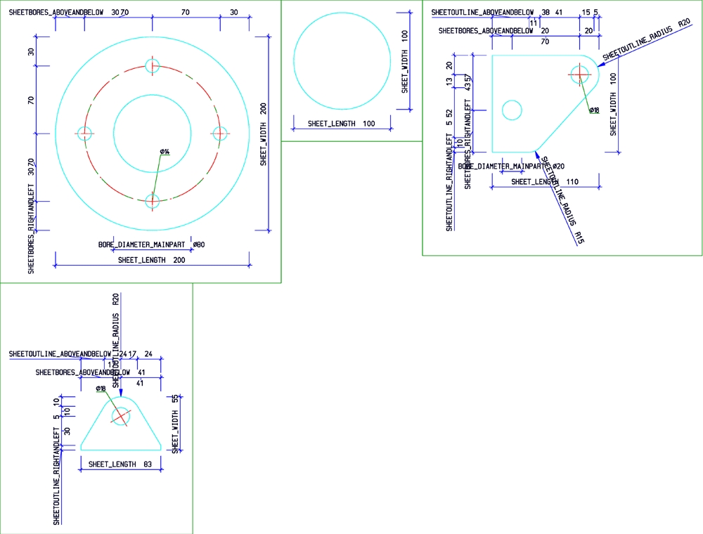 Die Bemaßungsregeln 8 und 10 vermaßen Blech-Nebenteile auch dann, wenn die Blechfläche parallel zur Ansicht liegt und das Teil Bohrungen enthält.