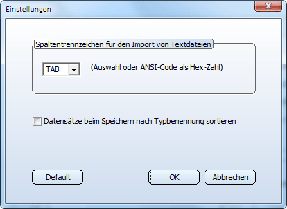 Spaltentrennzeichen (Hex) für Import/Export von Textdateien Hier wird das Trennzeichen bestimmt,. mit dem die Elemente eines Datensatzes in der betroffenen Textdatei voneinander getrennt werden. Wählen Sie einfach das gewünschte Trennzeichen in der Listbox aus. TAB steht hier für das Tabulatorzeichen, SPACE für das Leerzeichen. TAB ist die Default-Einstellung. Für den Fall, dass das gewünschte Zeichen nicht in der Listbox enthalten ist, können Sie es auch manuell durch Eintragen der Hex-Zahl seines ANSI-Codes bestimmen. |