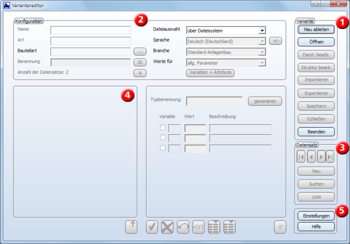 Nach dem Aufruf des Varianteneditors für den Anlagenbau wird das abgebildete Dialogfenster angezeigt.