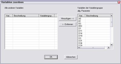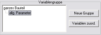 Rechts werden die Variablen angezeigt, die der vorher markierten Variablengruppe zugeordnet sind. Die linke Liste besteht aus allen anderen Variablen des Bauteils. Diese Liste ist hier zunächst leer, da wie erwähnt, alle Variablen der Gruppe allg. Parameter zugeordnet wurden.
