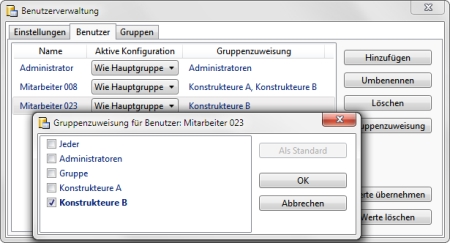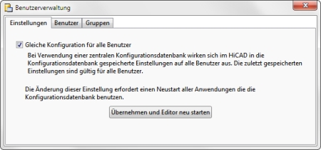 Die integrierte Benutzerverwaltung erlaubt das Anlegen und Löschen von Benutzerprofilen, sowie das Entfernen und Übernehmen von benutzerspezifischen Werten in ein anderes Benutzerprofil. Ein Administrator kann so z.B. vom Konfigurationsmanagement verwaltete Einstellungen innerhalb von HiCAD vornehmen, die zunächst unter seinem Windows-Benutzerprofil gespeichert werden. Diese Einstellungen können später als Firmenstandard in das Administratorprofil übernommen werden und gelten so für alle Benutzer.