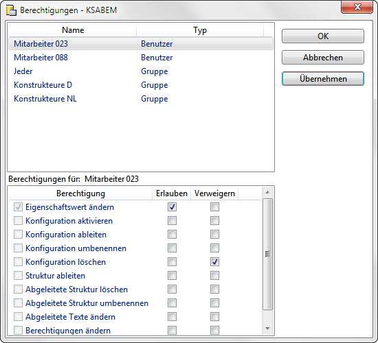Nach Aufruf der Funktion Berechtigung wird das Dialogfenster Berechtigungen.. angezeigt. Im Titel des Fensters wird außerdem der Name des aktiven Teilbaums der Konfigurationsstruktur angezeigt.