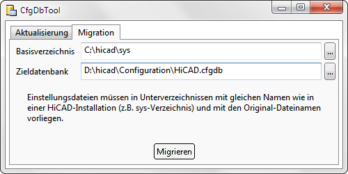 Bei einem HiCAD-Update werden die individuellen Einstellungen aus den DAT- und /XML-Dateien und dem Konfigurationsmanagement von HiCAD 2011/2012 automatisch in die Konfigurationsdatenbank von HiCAD 2013 übernommen.
