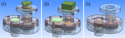 (1) Normale Anzeige, (2) Anzeige mit Hüllquadern, (3) Ausgeblendete Teile