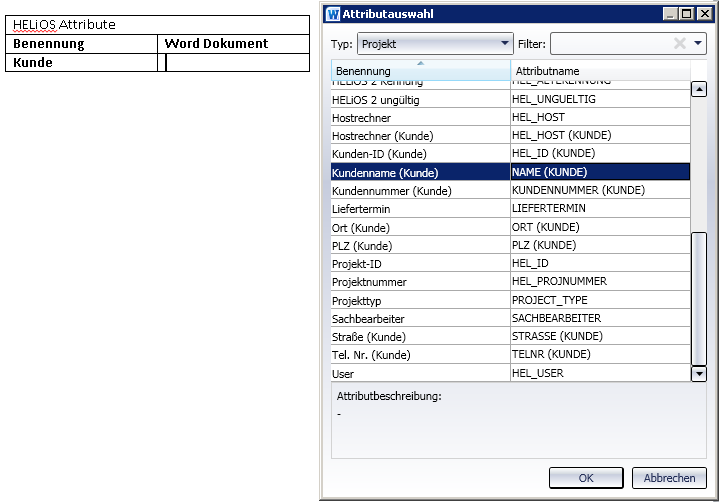 Nach Auswahl eines Attributs aus der entsprechenden Liste mit Doppelklick, bzw. Markieren und Bestätigen mit OK wird das Attributfeld dort eingesetzt, wo sich der Cursor in Word befindet.