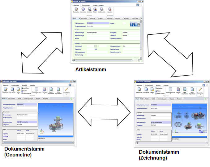 Der Artikelstamm (in früheren Versionen auch Bauteil- bzw. Teilestamm genannt), der Dokumentstamm des 3D-Modells (Dokument einer referenzierten Geometrie), und der Dokumentstamm der Zeichnung sind dabei über folgende CAD-Verknüpfungen miteinander verknüpf: