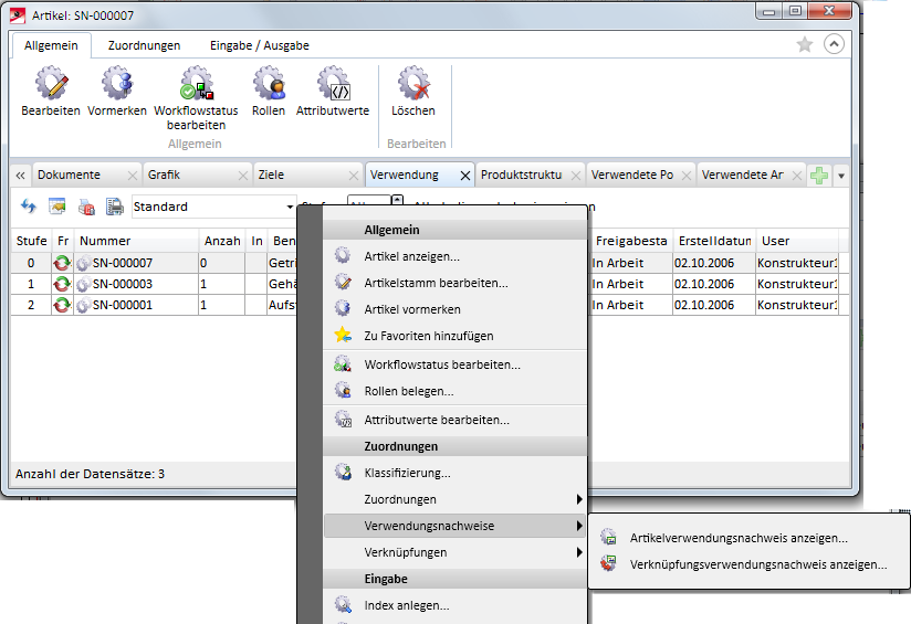 Im Reiter Verwendung eines Artikel-Detailfensters kann über das Kontextmenü der rechten Maustaste ein Artikelverwendungsnachweis durchgeführt werden. Dafür muss die Teilestruktur in die Produktstruktur übertragen werden. Beachten Sie dabei, dass nur eine Stufe übertragen wird.