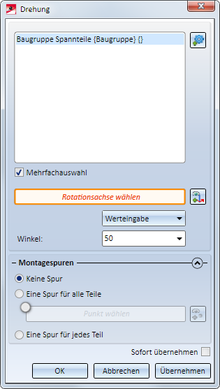 Ist diese Checkbox Sofort übernehmen aktiv, dann wird die Transformation sofort - wie in der Vorschau dargestellt - übernommen und in das Explosionsprotokoll eingetragen, d.h. Sie müssen nicht die Schaltfläche Übernehmen anklicken.