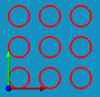 In diesen Beispielen ist unten links das Verlegekoordinatensystem zu sehen. Direkt daran angrenzend liegt das "Ausgangsloch", sodass dieses komplett oberhalb der X- und rechts der Y-Achse liegt. Das Lochmuster wird von diesem Loch ausgehend bestimmt.
