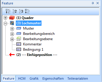 Die Funktion Lochmuster erzeugt bei ihrer Benutzung einen Eintrag im Feature-Protokoll: