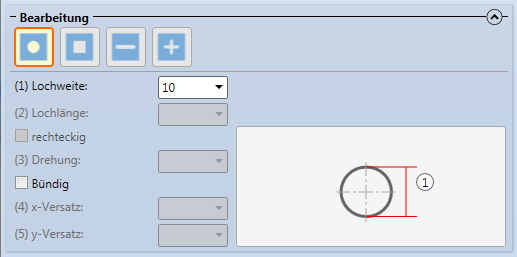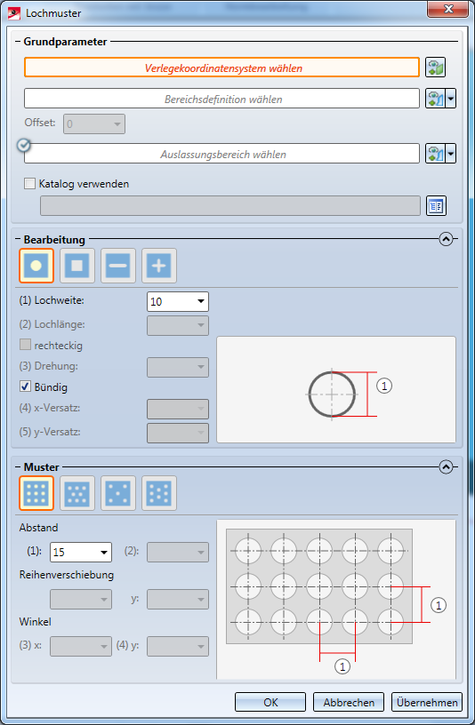 Es sind stets nur die Parameter aktiv, die für die gewählte Lochform sowie das gewählte Muster auch verwendet werden können. Zur Verfügung stehen: