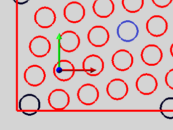 In diesem Beispiel wurde eine quadratische Platte mit einem geraden Lochmuster überzogen. Der Bearbeitungsbereich ist ein Sechseck; zusätzlich ist ein sechseckiger Auslassungsbereich definiert. Das Verlegekoordinatensystem befindet sich in der linken, unteren Ecke der Platte: