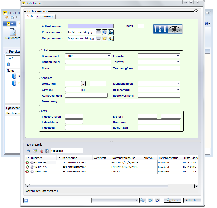 Starten Sie zunächst HELiOS-Desktop und erzeugen Sie über die Artikelsuche mit Vorgabe geeigneter Suchbedingungen eine Ergebnisliste, die die Artikelstämme enthält, die Sie für die Bauteil-Variante verwenden wollen. Lassen Sie dieses Fenster offen, es wird später noch benötigt.