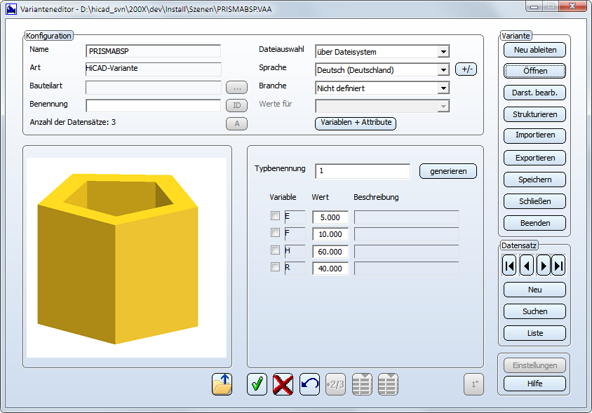 auf und speichern das Bauteil als Variante, z.B. Prismabsp.vaa. Die Variante enthält jetzt genau einen Datensatz. Ein Vorschaubild wird automatisch erzeugt.