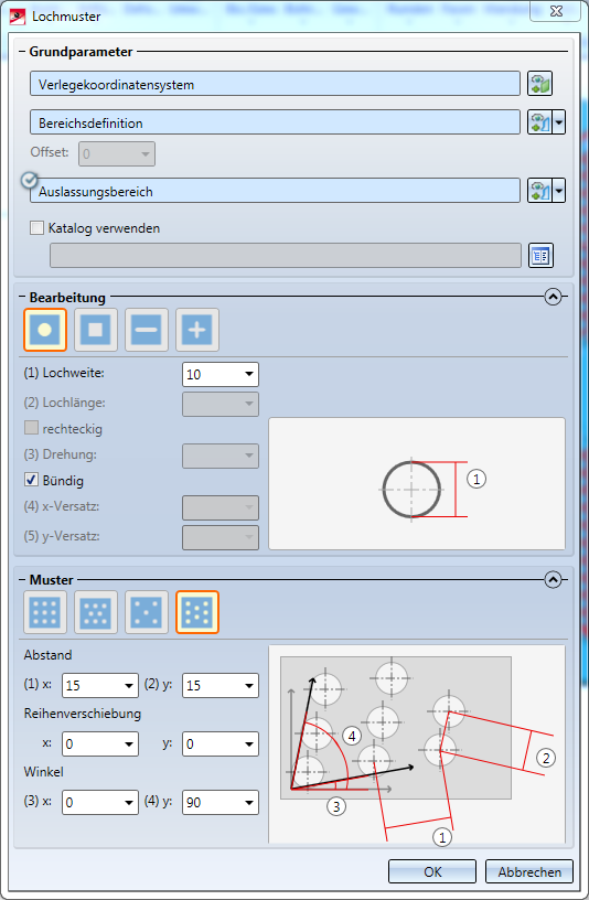 Es sind stets nur die Parameter aktiv, die für die gewählte Lochform sowie das gewählte Muster auch verwendet werden können. Zur Verfügung stehen: