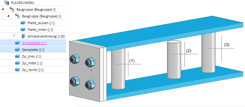 Im abgebildeten Beispiel sind vor dem Aufruf der Funktion die Grund- und Deckplatte ausgewählt worden. Im Modus Gewählte Teile wurden dann die Zylinder (1) bis (3) ausgewählt.
