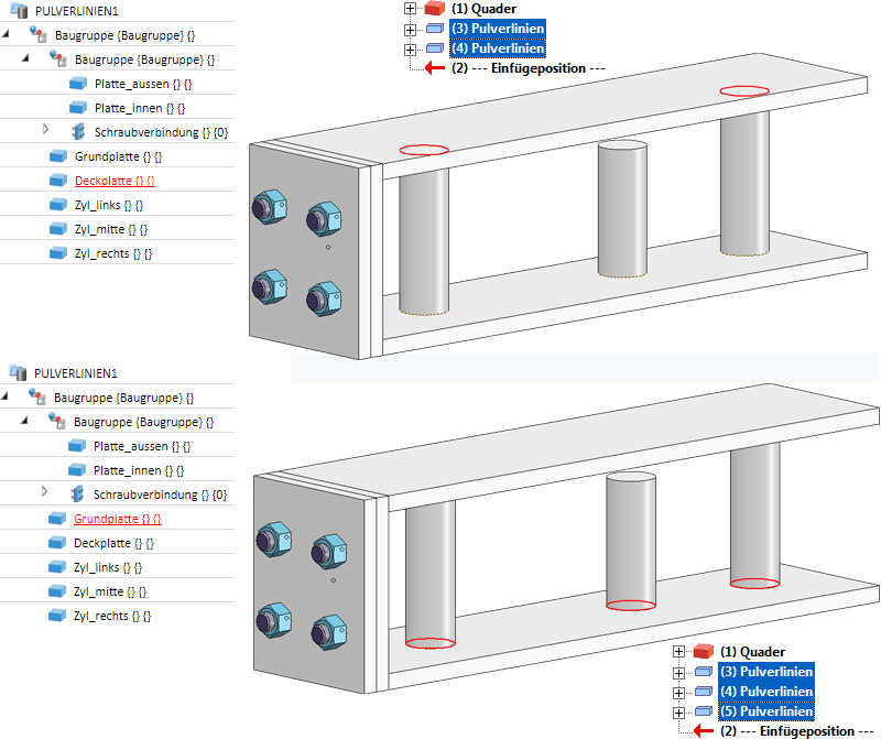 HiCAD ermittelt dann automatisch die Pulverlinien, die durch die drei Zylinder sowohl auf der Grund- als auch auf der Deckplatte entstehen.
