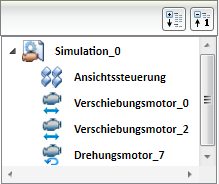 Links im Andockfenster wird der Simulationsbaum angezeigt. Hier werden alle definierten Motoren der gewählten Simulation aufgelistet. Neu angelegte Motoren erhalten automatisch vergebene Namen (Verschiebungsmotor_0, Drehungsmotor_1, …).