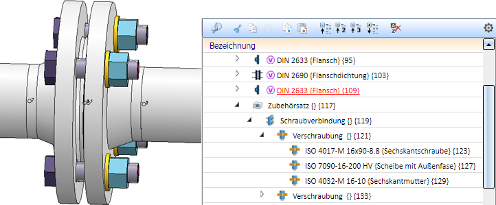 Beim Einbau einer Flanschverschraubung wird auf der gleichen Teilestrukturebene, auf der die Flansche und die Dichtung liegen, ein Leerteil eingefügt, das im ICN mit Zubehörsatz bezeichnet wird. Darunter liegt die Verschraubungsgruppe, bezeichnet mit Verschraubung, die die Flanschverschraubung abbildet. Sie besteht in diesem Fall aus vier Einzelverschraubungen, die sich aus Schraube, Scheibe und Mutter zusammensetzen. Das Teil Zubehörsatz ist durch einen internen Verweis dem Flansch zugeordnet, auf dem sich die Schraubenköpfe befinden (linker Flansch in der Abbildung. Auch die Dichtung ist in der Regel diesem Flansch zugeordnet. Wird dieser Flansch gelöscht, werden auch das Zubehörsatz-Teil (und damit die Flanschverschraubung) und die Dichtung gelöscht.