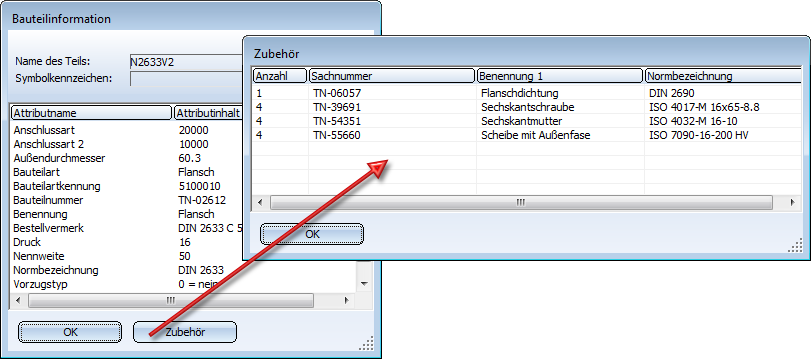 Die Bauteilinformation zu dem linken Flansch zeigt an, dass Zubehörteile existieren. Ein Klick auf Zubehör liefert die Liste der Zubehörteile: