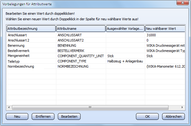 Im Beispiel oben sind die bei der letzten Eingabe belegten Bauteilattribute aufgeführt. Für die anderen Zeilen sind keine Vorlagewerte ausgewählt, die Spalte Ausgewählter Vorlagewert ist leer. Mit Neu, Entfernen und Bearbeiten können Vorlagewerte festgelegt werden. Es kann aber auch durch Doppelklick ein Wert der Spalte Neu wählbarer Wert übernommen werden.