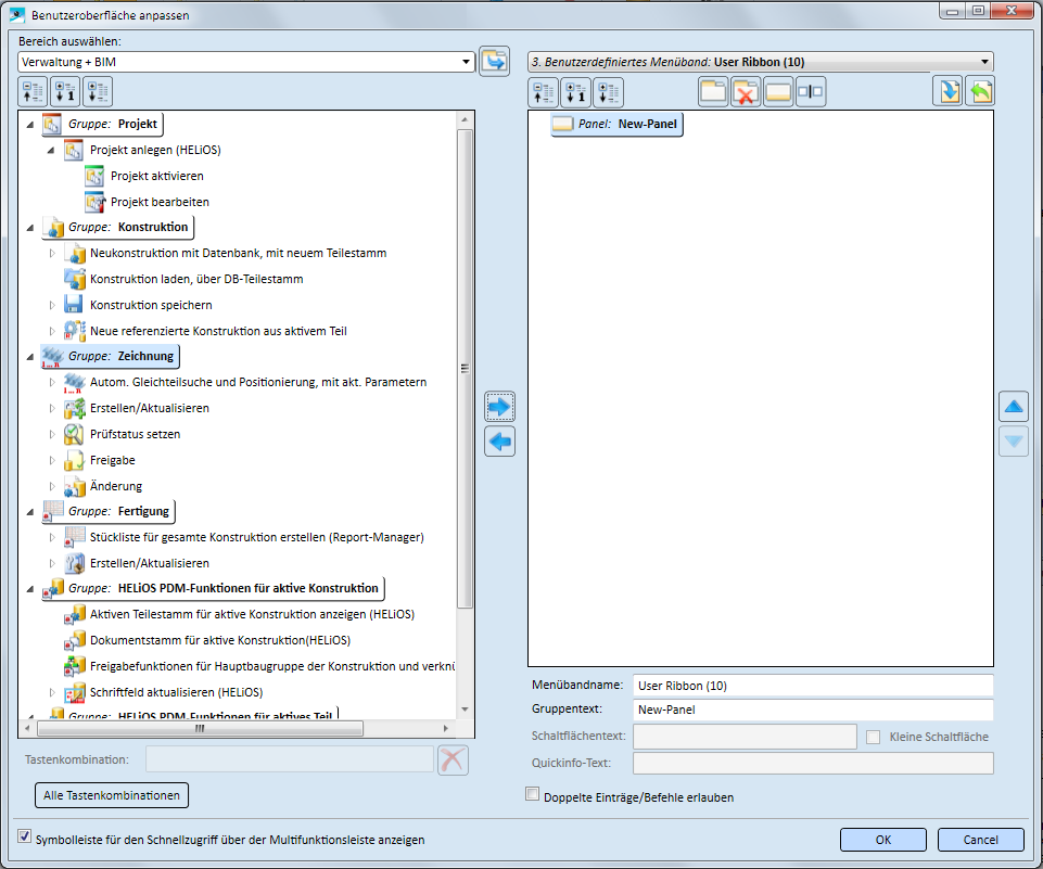 - Wählen Sie links oben in der Auswahlbox Bereich das HiCAD-Menüband, aus dem Sie Funktionen in Ihr neues Menüband übernehmen wollen.