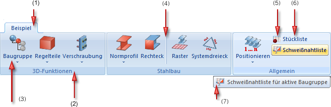 (1) Menübandname, (2) Menügruppe, (3) (4) Separator, (5) kleine Schaltfläche, (6) Schaltflächentext, (7) Quickinfo-Text