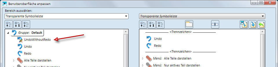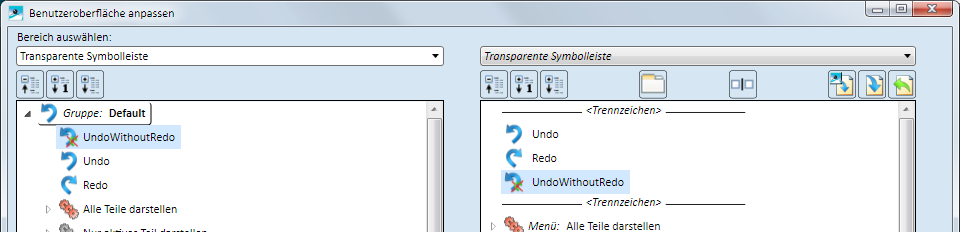 Beim Aufruf der Undo-Funktion wird eine Redo-Sicherung erstellt, was in großen Konstruktionen zu längeren Wartezeiten führen kann. Für solche Fälle bietet HiCAD die Möglichkeit eines Undo ohne Redo. Diese Funktionalität finden Sie allerdings nicht in der Standard-Benutzeroberfläche. Um die Funktion nutzen zu können, müssen Sie die transparente Symbolleiste wie folgt anpassen: