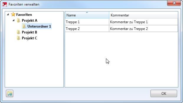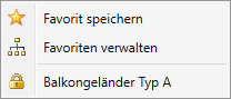 Beachten Sie bitte, dass Favoriten immer zu einem Dialog gehören. Wenn Sie also beispielsweise die Favoritenverwaltung im Dialogfenster des Treppenkonfigurators aktivieren, werden Ihnen dort nur die Favoriten zum Treppenkonfigurator angezeigt.