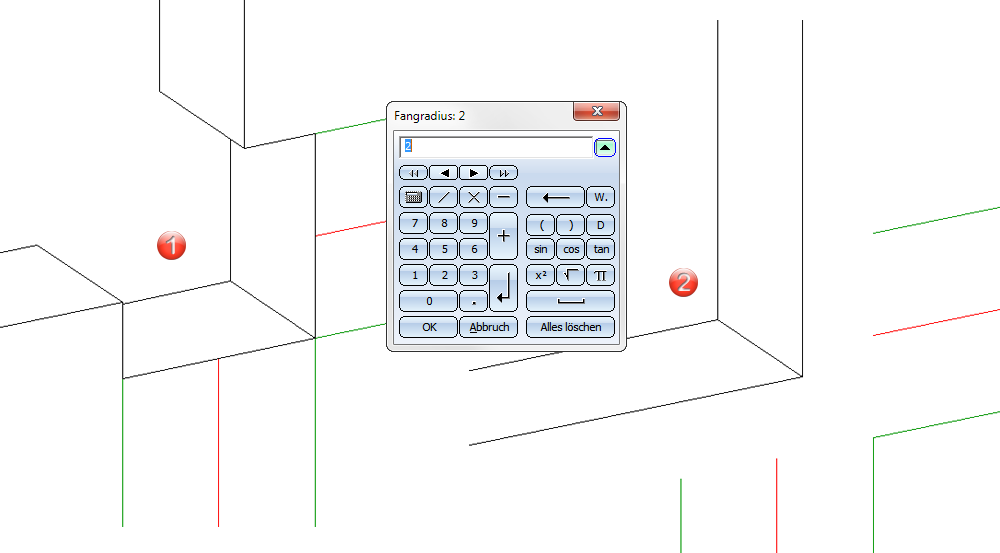 Mit dieser Funktion löschen Sie Rundungen und Fasen. Identifizieren Sie dazu zwei Kanten der zu löschenden Rundung oder Fase. |