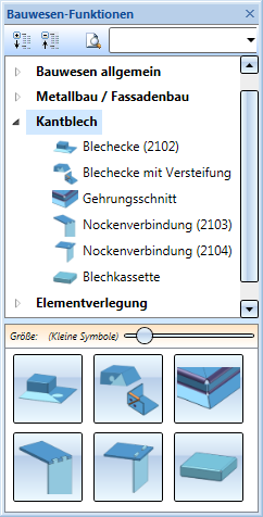 Der Einbau von Designvarianten im Blech erfolgt über das Andockfenster Bauwesen-Funktionen.