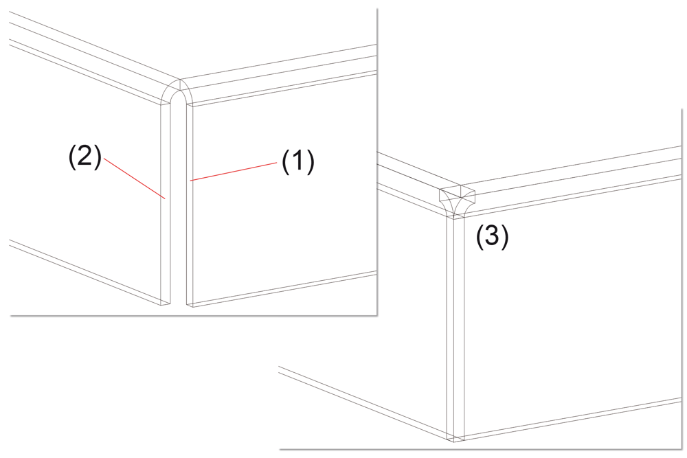 Mit dem Modus Ecke schließen Außenkanten bündig, Biegezone zu wird jedes Blech bis zur äußeren Kante des anderen Bleches verlängert. Das gilt auch für die Biege bzw. Fräskantzone.