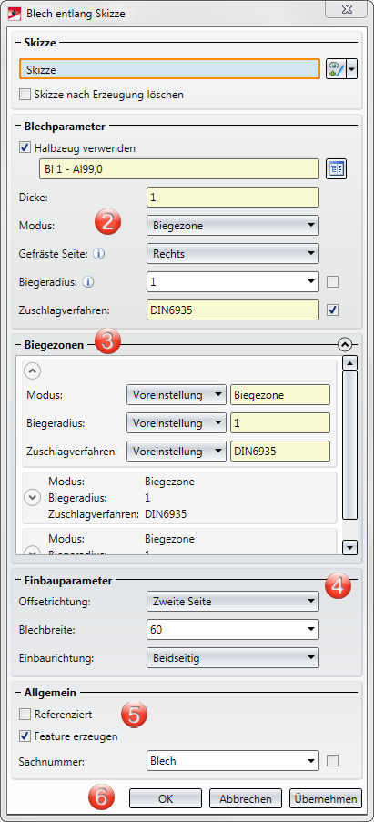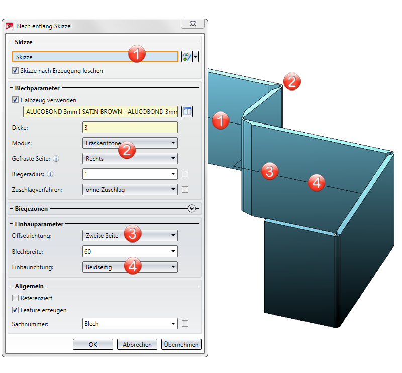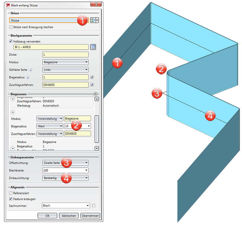 Haben Sie alle erforderlichen Daten eingegeben, dann kann das neue Blech erzeugt werden. Bei Wahl von Übernehmen oder mit einem Klick der mittleren Maustaste wird das Blech eingebaut, das Dialogfenster bleibt jedoch - im Unterschied zu OK - geöffnet. So können Sie die Daten ändern und mit Übernehmen einer anderen Skizze zuweisen. Wenn Sie das Dialogfenster mit Abbrechen verlassen, wird die Funktion ohne Einbau bzw. ohne Änderung abgebrochen.