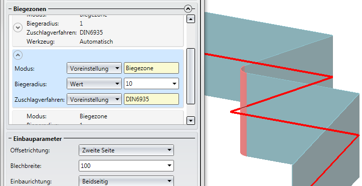 Aus Halbzeug neben dem Biegeradius. Im Bereich Biegezonen können Sie auch bei gewähltem Halbzeug den Biegeradius ändern.