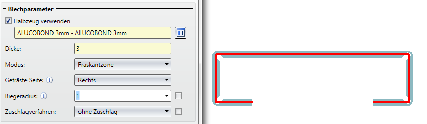 Bei der Option Modus können Sie zwischen Biege- und Fräskantzone wählen. Die Fräskantzone wird in der Praxis bei Verbundplatten eingesetzt. Für die gefräste Seite, die nur bei der Fräskantzone ausgewertet wird, ist die Richtung der Skizze ausschlaggebend. Die Einstellung wird als Voreinstellung für das komplette Blechteil übernommen und kann im Bereich Biegezonen oder über das Feature für jede Fräskantzone einzeln geändert werden.