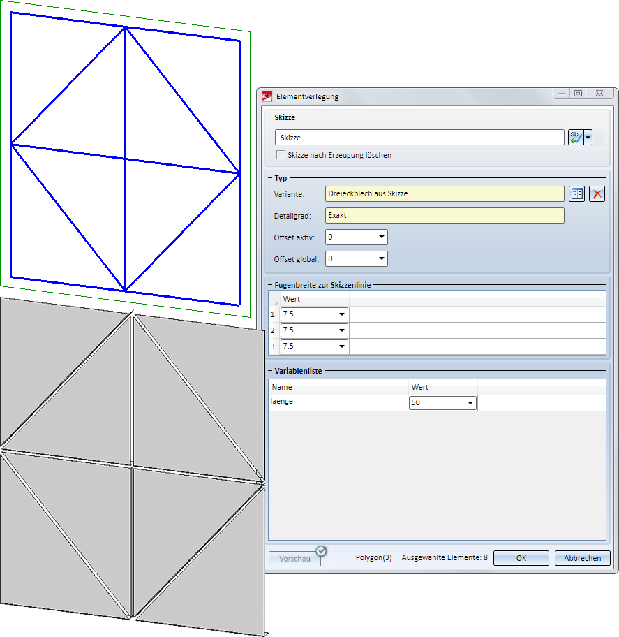 Im folgenden Beispiel soll ein nicht rechteckiges Verlegeelement erstellt werden - ein dreieckiges Kantblech mit angekanteter Lasche. Das Blech soll aus einer Skizze abgeleitet werden und die Länge der Lasche soll variabel sein.