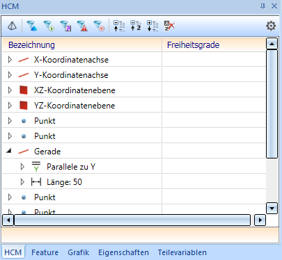 Dabei bietet die Registerkarte HCM einen guten Überblick über die vergebenen Lage- und Maßbedingungen. Dabei wird bei Baugruppen auch aufgeführt, wie viele Freiheitsgrade noch vorliegen.