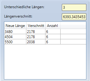 Darunter werden die verschiedenen Längen in Tabellenform angezeigt. Diese sind nach Länge sortiert, wodurch Elemente, die eine ähnliche Länge haben und somit relativ verschnittarm optimiert werden können, direkt nacheinander aufgelistet werden. Zusätzlich wird aufgeführt, wie viele Elemente dieser Länge existieren und wie viel Verschnitt durch Teile mit dieser Länge insgesamt entsteht.