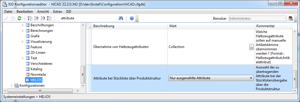 Bei der Erstellung von Stücklisten aus einer Produktstruktur ist es möglich, festzulegen, welche Attribute hierbei an den Report Manager übergeben werden sollen. Diese Einstellung erfolgt m Konfigurationsmanagement im Pfad Systemeinstellungen > HELiOS. Hier befindet sich der Punkt Attribute bei Stückliste über Produktstruktur.
