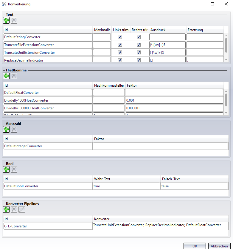 Vergeben Sie in der Zeile, die der Liste hinzugefügte wurde, durch Eingabe und Enter eine eindeutige Bezeichnung in der Spalte Id und machen Sie entsprechende Angaben den gewünschten Konvertierungsoptionen betreffend.
