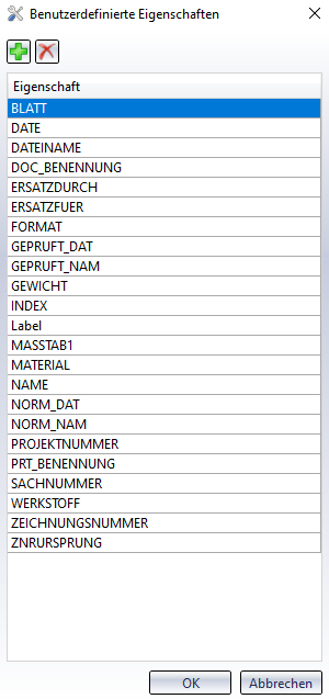 Sie finden im Dialogfenster bereits eine gewisse Anzahl an vordefinierten Eigenschaften, die Sie für das Mapping zwischen CAD und HELiOS (z.B. für die Ausgabe von Attributen in Zeichnungsschriftfeldern) verwenden können.