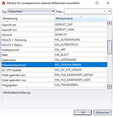 Nach Auswahl eines Attributs aus der entsprechenden Liste mit Doppelklick, bzw. Markieren und Bestätigen mit OK wird das entsprechende Attribut als Anzeigename für Dokumente in AutoCAD gesetzt.