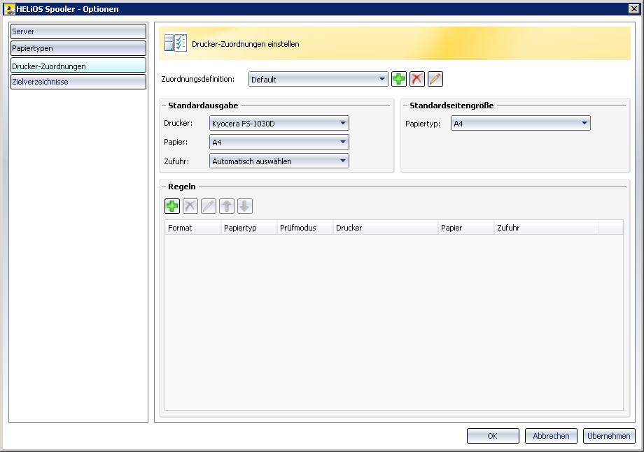 Im Bereich Drucker-Zuordnungen können Sie z.B. verwalten, bei welchem Papiertyp der Auftrag an welches Ausgabegerät geschickt werden soll.