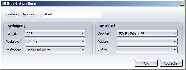 Rechts unter Druckziel lässt sich der Drucker, an den die Datei bei dieser Regel geschickt werden soll auswählen. Dies ist z.B. denkbar, wenn alle Formate, die in Sonderfällen etwa größer als A3 sind, an einen anderen Drucker geschickt werden sollen, als an den eigentlich unter Zuordnungsdefinition standardmäßig eingestellten, weil dieser nicht für diese Papiergröße beschaffen ist. Papier und Zufuhr hängen vom jeweiligen Druckertyp ab und sind auch hier optional (bei keiner Auswahl werden die Standardeinstellungen des Ausgabegeräts genommen).